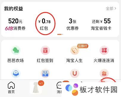 1、进入淘宝,点击右下角的【我的淘宝】,在我的权益这一栏可以看到【红包】;
