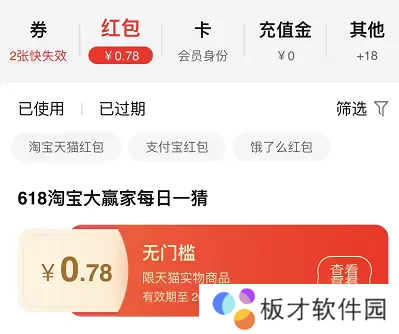 2、点击进入在红包的选项里面可以看到【618淘宝大赢家每日一猜】的无门槛红包,红包是有使用时间限制的大家记得及时使用哦。