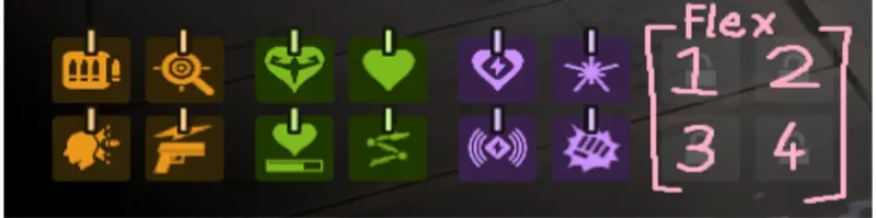 背包中的装备按类别分类成块。最左边的块是橙色的,用于武器物品,中间第是绿色的,用于活力物品,右边第二个是紫色的,用于精神物品,最右边的是弹性插槽。弹性插槽与其他类别的不同之处在于,你可以为它们购买任何先前类别中的任何物品。要解锁每个弹性插槽,你需要满足以下条件: