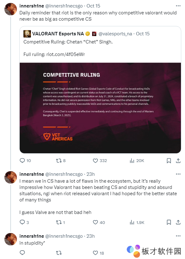 “每日提醒:Riot是VALORANT永远不会像CS一样流行的唯一原因。虽然我们的CS生态系统也存在很多问题,但令人惊讶的是,VALORANT竟然在愚蠢和荒谬方面击败了CS。当Riot宣布发布他们的最新FPS游戏时,我曾希望很多事情会变得更好。