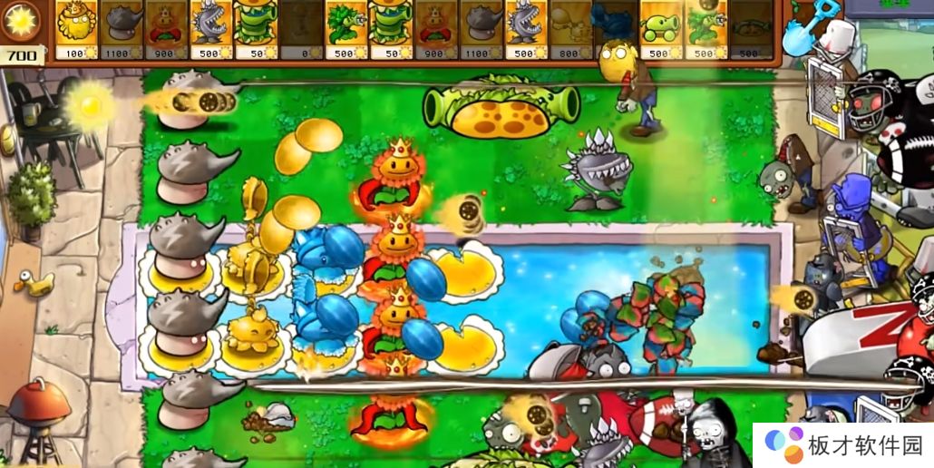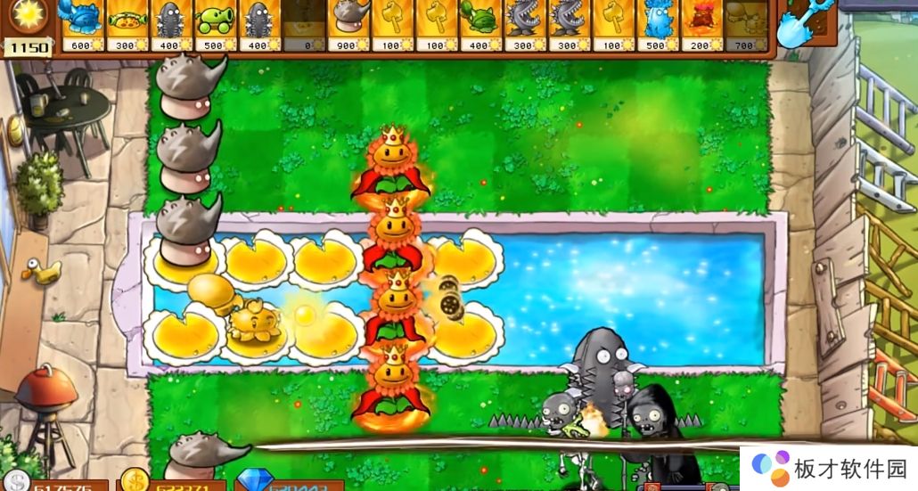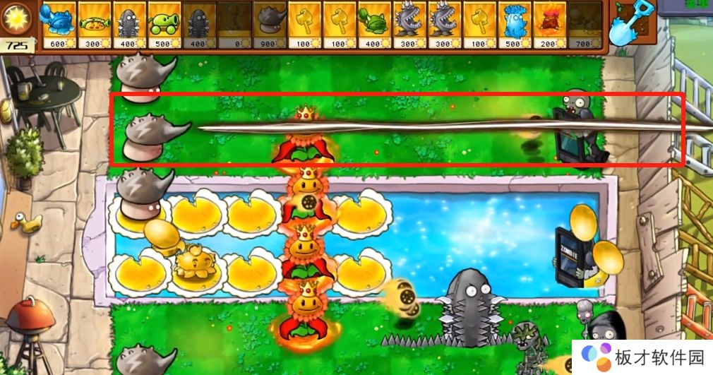 ①每1.5秒对一行内的所有僵尸造成80伤害,对僵尸的所有防具造成双倍伤害,25%概率使僵尸僵直1秒