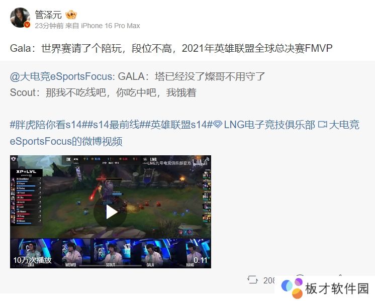 直播吧10月15日讯 近日LNG官方发布S14瑞士轮比赛期间的赛事语音视频,在看到Scout面对GALA时“卑微”的态度;管泽元也更博调侃:Gala:世界赛请了个陪玩,段位不高,2021年英雄联盟全球总决赛FMVP。
