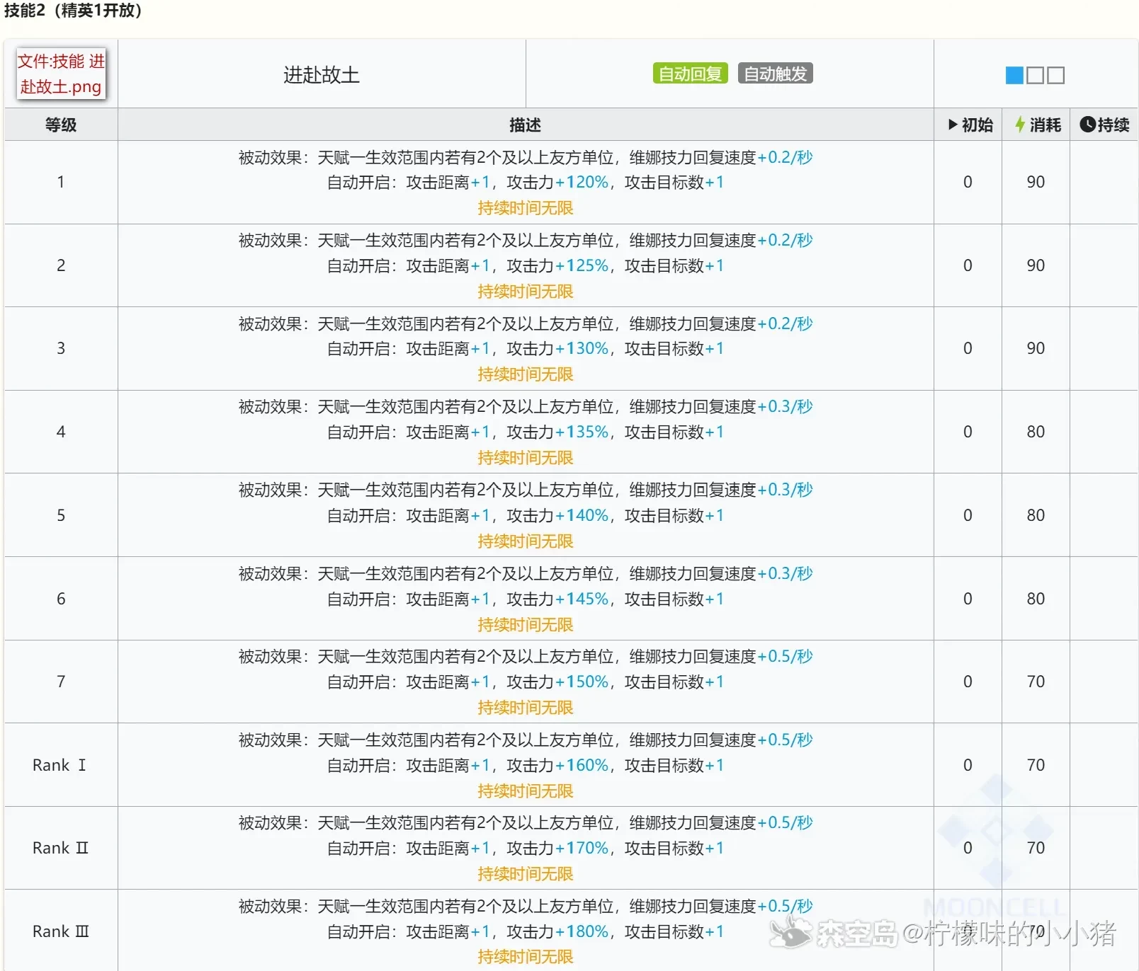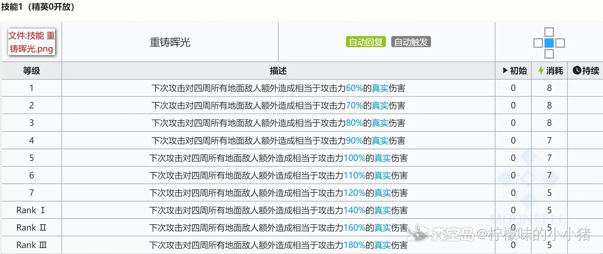 传说中的常驻法伤基石,周围2单位及以上的话有个加sp回复的效果,触发以后只需要46.6s暖机,锦上添花。暖机后打2,单次伤害2164,正常使用一般是放在盾后当煌用,所以基本上是1-2个额外单位,1额外单位单次攻击2210,dps1768,2额外单位单次攻击2257,dps1805,和无模组2技能澄闪差不多,算是比较优秀的法伤输出了,如果没煌可以酌情专精平替一下。