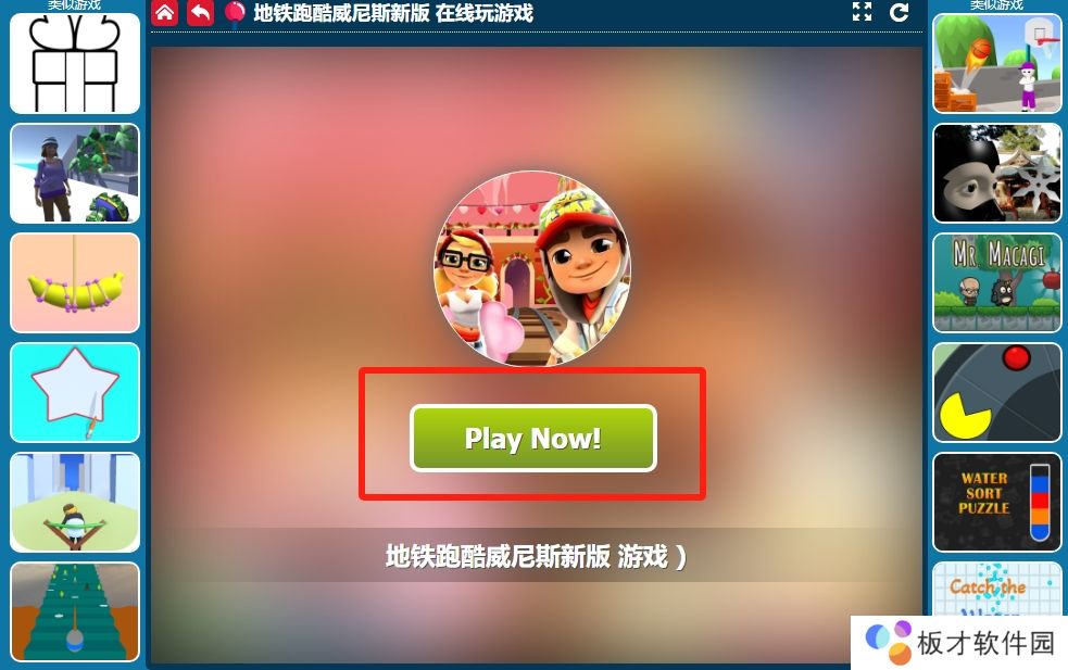 1、复制上方链接来到浏览器粘贴并跳转,来到地铁跑酷在线玩页面,点击“play now”。