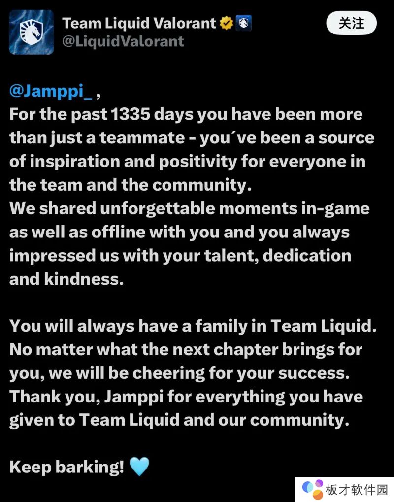 Team Liquid官方原文如下:在过去的1335天里,你不仅仅是一名队友——你是团队和社区中灵感和积极的来源。我们一起经历了许多难忘的游戏内外的时刻,你总是用你的才华、奉献和善良打动我们。你将永远是Team Liquid的一员。无论接下来你会面对怎样的篇章,我们都会为你的成功加油。
