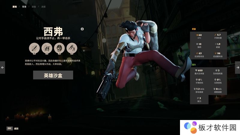 他的武器是一把单手喷,射击间隔长,但相对的是单发伤害高。