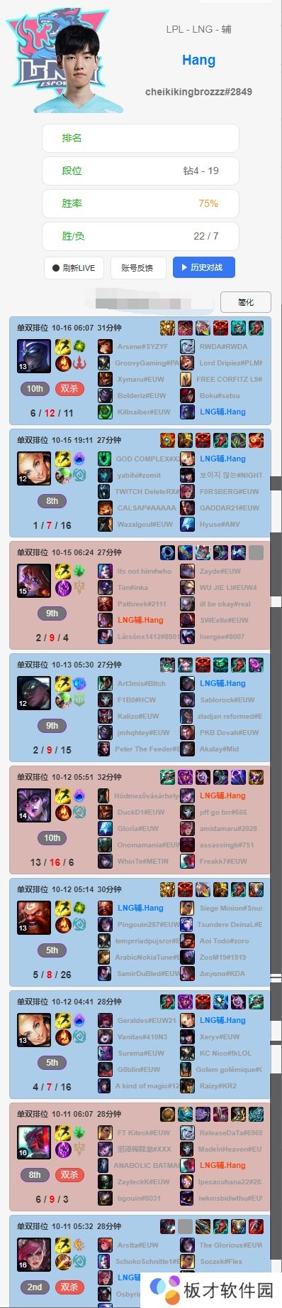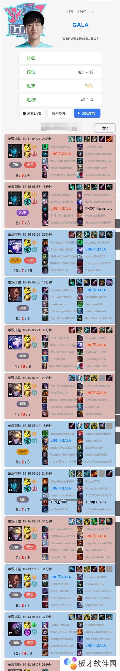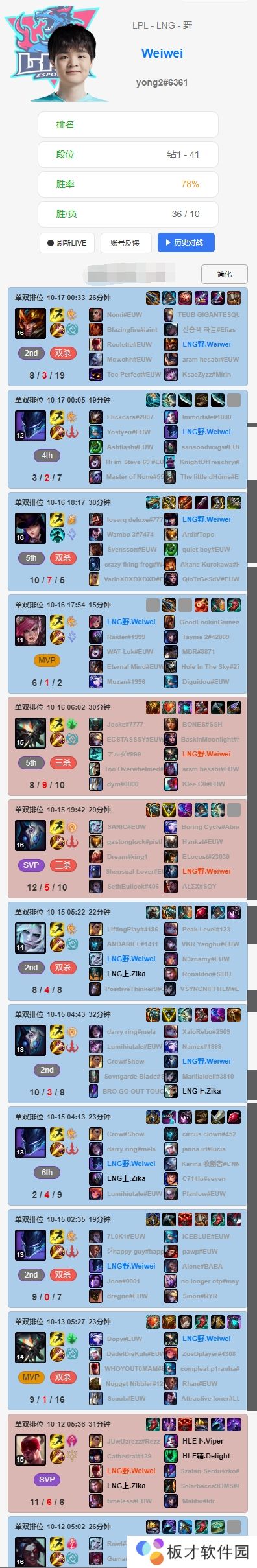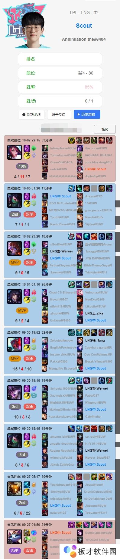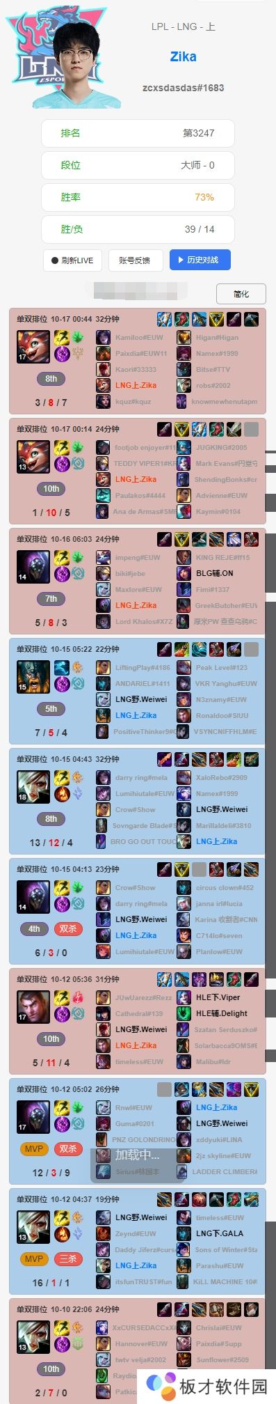 直播吧10月17日讯 根据排位统计小程序显示,LNG选手们赛前Rank情况如下:Scout最近七天未进行排位;Zika连续使用上单小火龙,战绩一般;Weiwei排位豪取四连胜;GALA滑板鞋两连败,寒冰豪取20-7-15的华丽战绩;Hang使用了多个不同的辅助英雄。