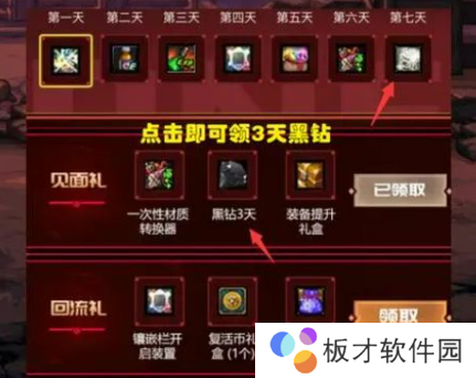 下方还有“见面礼”,这是所有玩家都可以领取的,3天黑钻+1个提升礼盒。