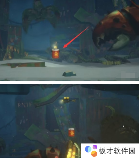 3、二阶段我们的攻击方式相同,依旧是将地上的油桶搬到它头上给他来一下。