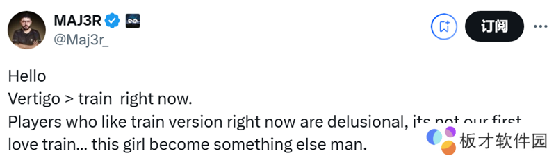 Eternal Fire战队选手MAJ3R在社交平台上发布动态,他认为当前Vertigo好于Train。