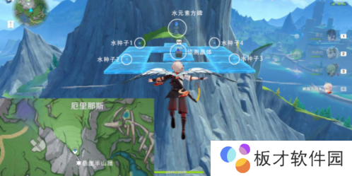 传送厄里纳斯南方向山顶锚点,往地图的东南方向下飞,前往悬崖半山腰;激活图中1个水元素方碑,拾取3个水种子,激活侦测晶体。