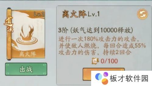 1、装备离火阵,攻击敌人的同时产生燃烧效果,造成额外伤害。