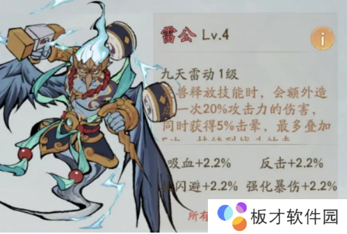 1、首先选择“雷公”,在角色释放技能时,可以额外造成20%伤害且获得5%击晕。