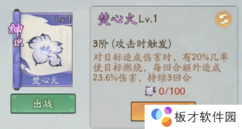 2、焚心火到达3阶时,可以在攻击时有20%机率产生燃烧效果。