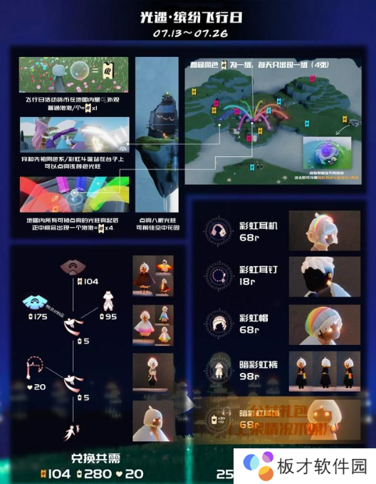 活动时间内用蜡烛或者爱心可以找先祖限时兑换物品,可以兑换的物品包括了彩虹耳坠、彩虹斗篷和彩虹链带短袖裤装。