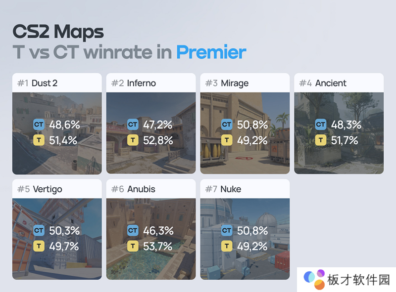 近日,数据运营商SCOPE.GG统计了在CS官匹优先模式中,各地图的CT、T方胜率情况。其中,Anubis是进攻方胜率最高地图,T方胜率高达53.7%,而CT方胜率最高的地图为Nuke和Mirage,但胜率仅为50.8%。