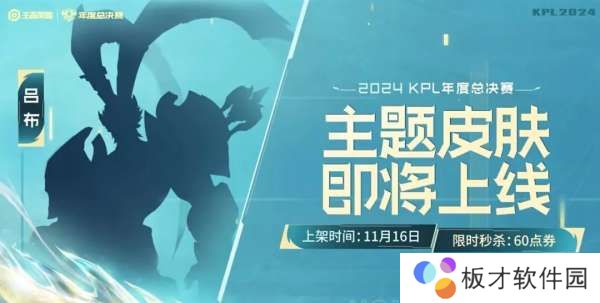 吕布KPL年度总决赛主题皮肤,将于11月16日零点上架,售价60点券,目前海报建模和技能特效暂未公布。