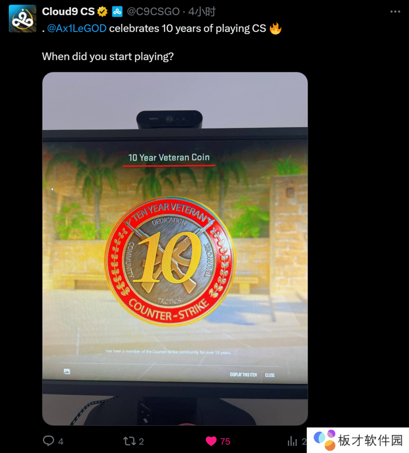 Cloud9官方在社交平台上发布动态,恭喜队内选手Ax1Le喜提10年老兵硬币。考虑到Ax1Le当前仅有22岁,意味着他至少在12岁的时候就已经接触了CS。