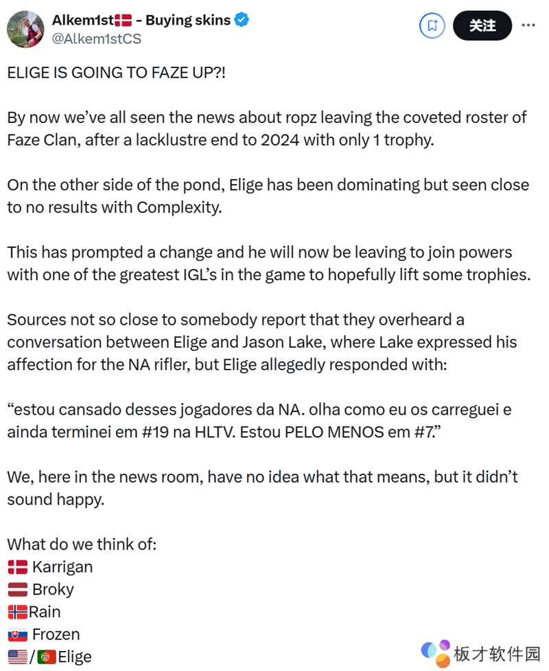 今天爆料人Alkem1st在社交平台上透露,EliGE有可能会加盟FaZe战队。