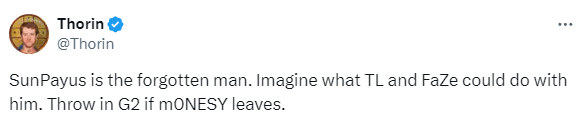 英国知名电竞记者Thorin今日在个人社交媒体账号上分享了对西班牙狙击手SunPayus的看法和未来的可能性。