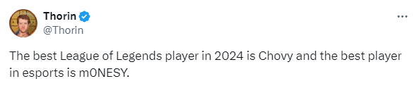 此前,他还分享了自己对m0NESY的看法:“2024年英雄联盟最佳选手是Chovy,最佳电竞选手是m0NESY。”