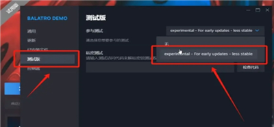 4、切换到【测试版】选项,在属性界面中,找到并点击测试版(Beta);