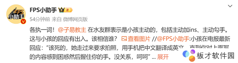 不过根据FPS小助手分享的消息,子易教主在水友群表示是小孩主动的,包括主动加ins、主动勾手。这与小孩的回应有出入。