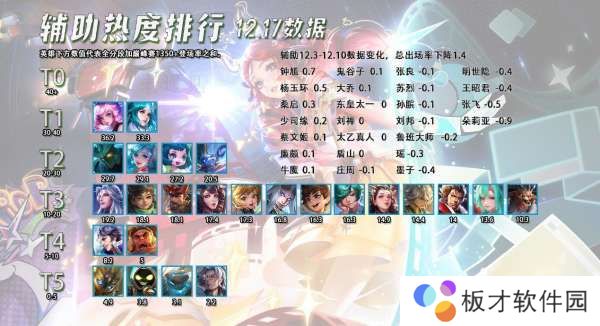 最近一周辅助的出场率波动非常小,大部分英雄都没什么变化,就是钟馗不知道怎么回事玩的人多了起来,难道是又有什么梗火了?王昭君虽然看起来出场率很高,但是经过一波调整以后,现在走辅助位的只有25%左右,换算下来在辅助位也是T4的存在。