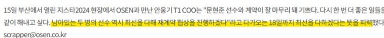T1.COO表达了将在即将到来的18日之前竭尽全力的意志,“很开心能好好收尾和Oner选手的合约。我们将会竭尽全力和剩下两名选手协商续约。”