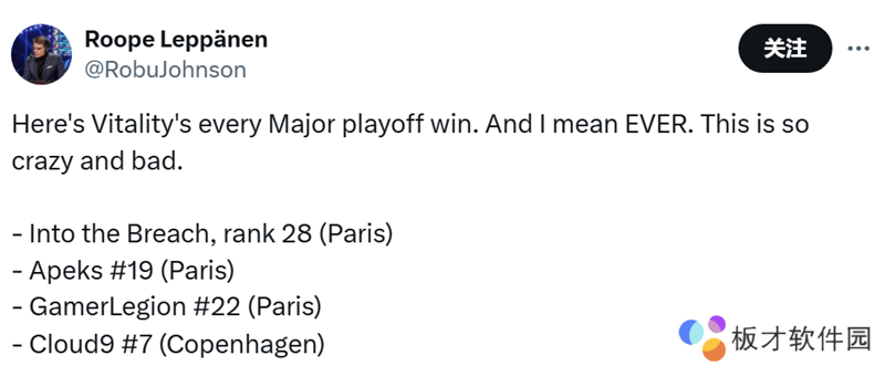 而如果看看Vitality在Major淘汰赛中的战绩,会发现他们在Major淘汰赛中从未战胜过Top5级别的战队。他们在Major淘汰赛中战胜过世界排名最高的队伍是