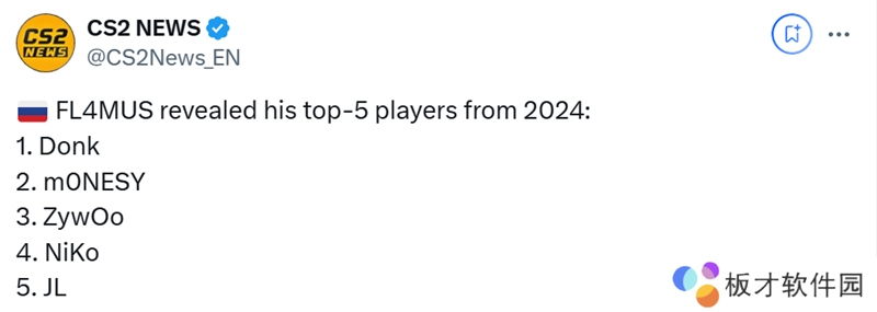 GamerLegion战队选手FL4MUS在社交媒体平台上分享了自己的2024年度Top5选手预测: