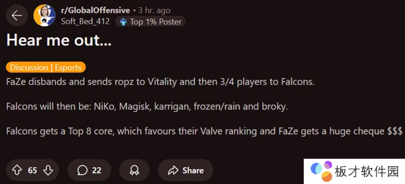 FaZe的选手身价或许比不上最顶级的m0NESY和NiKo,但如此大规模的变动也难得一见。最关键的还是Falcons能出得起钱,而且今年转会期我们被“雷到外焦里嫩”的次数还少么?之前又有多少人预想过ropz会去Vitality、NertZ会去