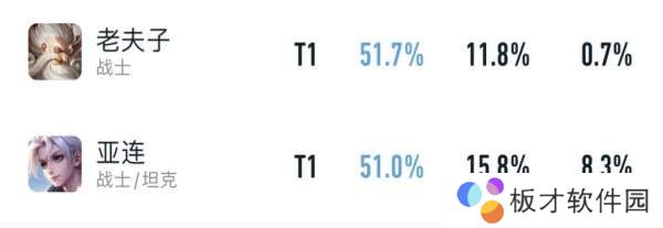 中高分段最吃香的战士英雄依旧是亚连和老夫子,不仅巅峰赛出场率胜率双高,并且小国标上榜分数也领跑对抗路。
