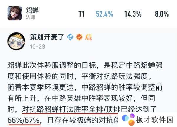 根据策划的回应:对抗路貂蝉全分段排位55%胜率,顶端局排位57%胜率,相当于现在中路玩法是严重拖貂蝉胜率后腿的。