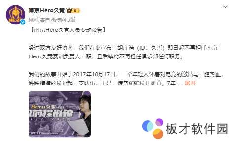 经过双方友好协商,我们在此宣布,胡庄浩(ID:久哲)即日起不再担任南京Hero久竞赛训负责人一职,且后续将不再担任俱乐部任何职务。
