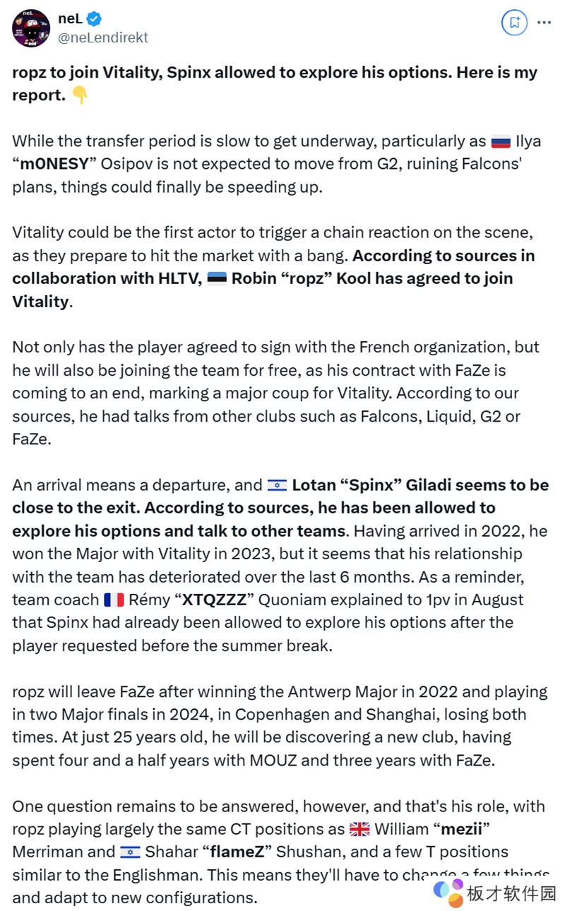 有新成员加入就意味着有成员离开,Spinx似乎即将离队。据消息人士表示,他已被允许寻求其他选择并与其他战队进行接触。他于2022年加入Vitality战队,并在2023年随队赢得了Major冠军,但在过去6个月里,他与战队的关系似乎已经恶化。值得一提的是,战队教练XTQZZZ今年在8月向法国媒体解释说,在Spinx于夏季休赛期前提出请求后,后者就已被俱乐部允许寻求其他选择。