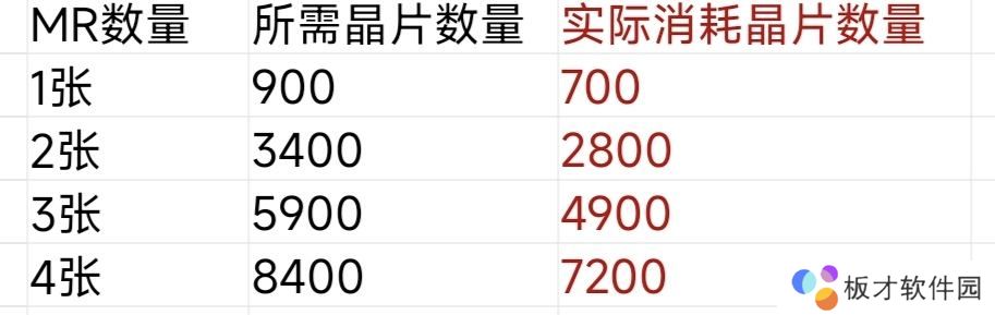 翻牌中每获得一张MR会返还200晶片,第50次、75次、100次翻牌也会分别返还200晶片,表中实际消耗晶片数=所需晶片数—返还晶片数