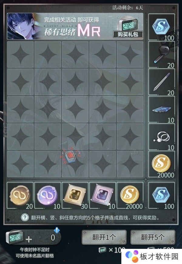 使用100午夜时钟/100晶片可翻开一张牌,获得一张MR需要翻完5*5区域内全部25张牌,即需要2500代币