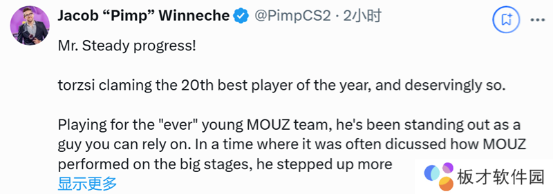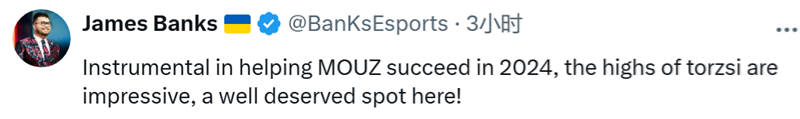 Banks:torzsi在助力MOUZ战队2024年取得成功的过程中发挥了重要作用,他的高光表现令人印象深刻,获此殊荣当之无愧!