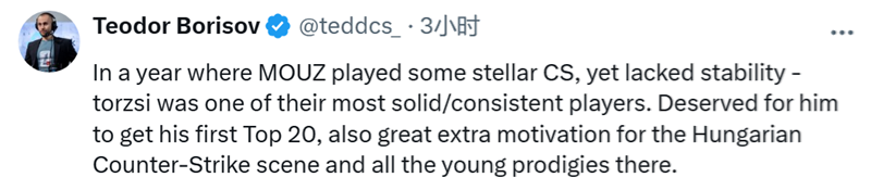 tedd:在这一年里,MOUZ战队打出过一些精彩的CS比赛,但缺乏稳定性,而torzsi是队中发挥最为稳健、表现最为稳定的选手之一。他首次跻身Top20实至名归,这对匈牙利的CS圈以及当地所有年轻的天才选手来说,也是极大的额外激励。