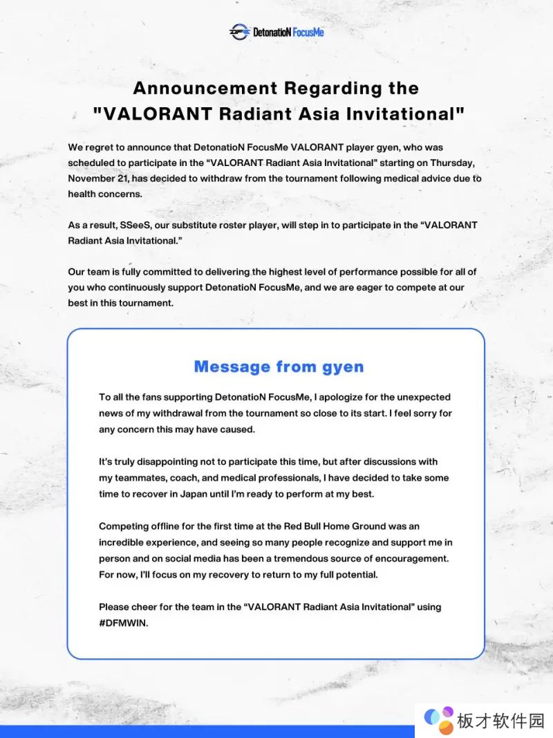 VCT PAC赛区DFM战队发文官宣:由于健康问题,gyen退出本届源能亚洲邀请赛,由SSeeS顶替。