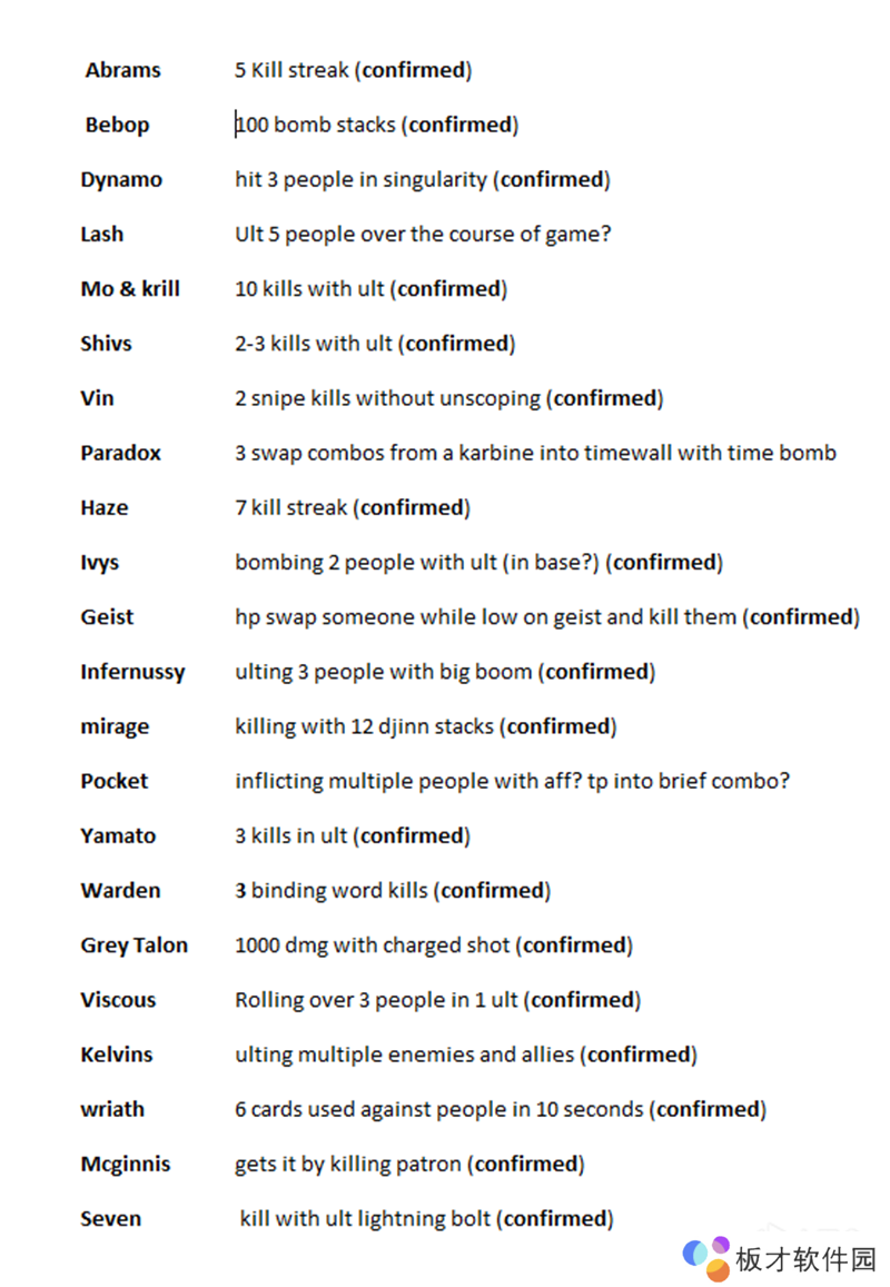 于是,在这讨论之间,一名玩家做了总结表,只有完成这些特殊任务就会立即获得皮肤(是否永久未知)
