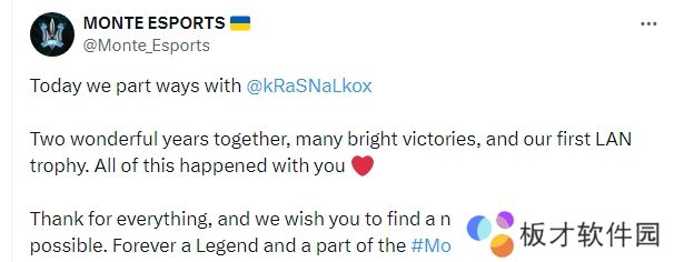 Monte战队在社交媒体发布声明:“今天我们与kRaSnaL告别。两年的美好时光,许多辉煌的胜利,还有我们的第一个线下奖杯。所有这一切都是与你一起经历的。感谢你做的一切,祝你尽快找到新的归宿。永远是传奇,也永远是Monte的一部分。”