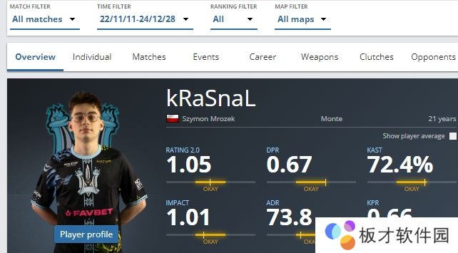 在Monte效力期间,kRaSnaL的平均rating为1.05,线下比赛的rating为1.00。