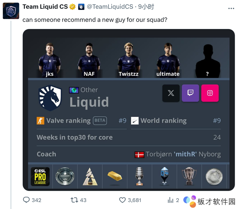 Liquid战队在社交平台上发布动态,向社区求助:有没有人能为我们的阵容推荐一名新成员(a new guy)?