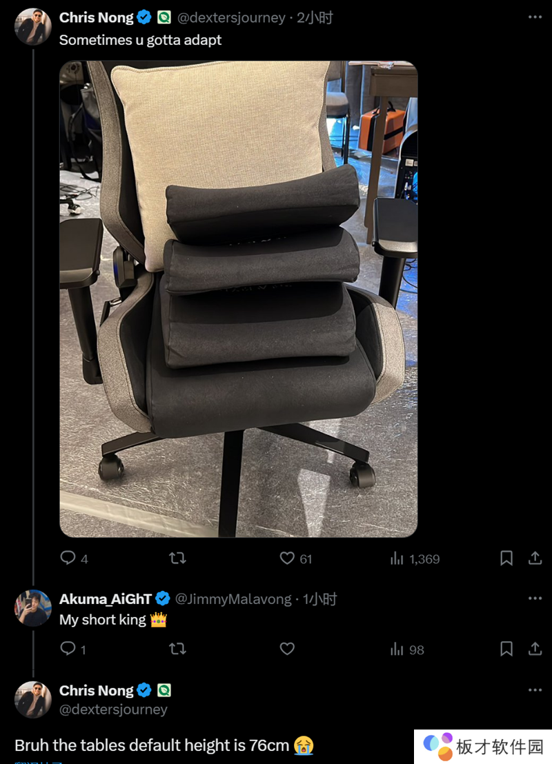 FlyQuest战队指挥dexter在社交平台上发布了一张照片,照片中的椅子上有三层垫子。dexter也写到:“有时候你需要适应。”