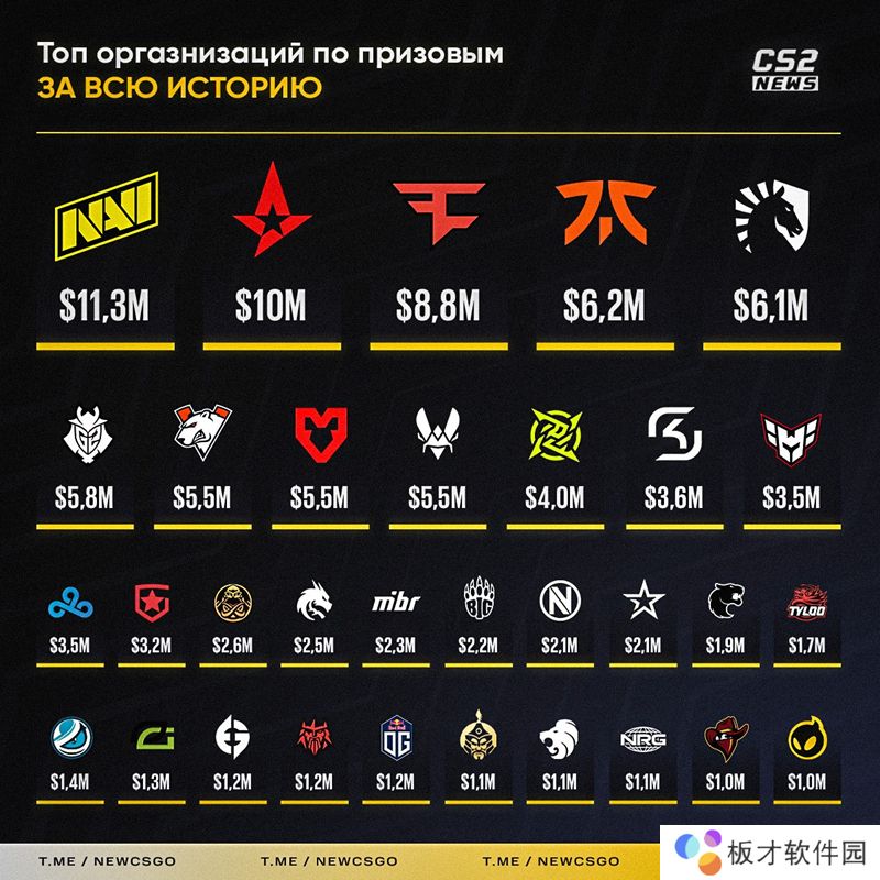 外媒统计了迄今为止在CS(包括CSGO和CS新版本)这个项目上获得百万美金奖金的队伍名单,其中