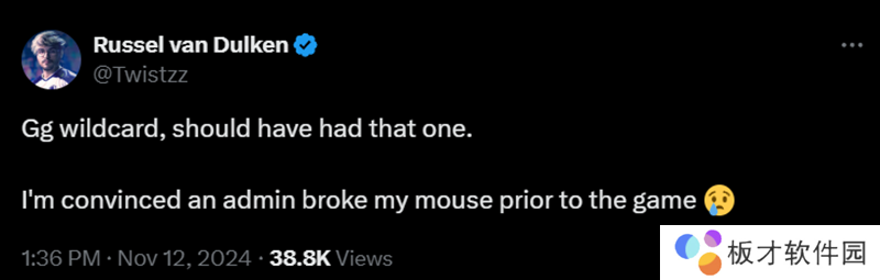 Twistzz在队伍爆冷输给Wildcard后,社媒发文调侃裁判在赛前弄坏了他的鼠标。
