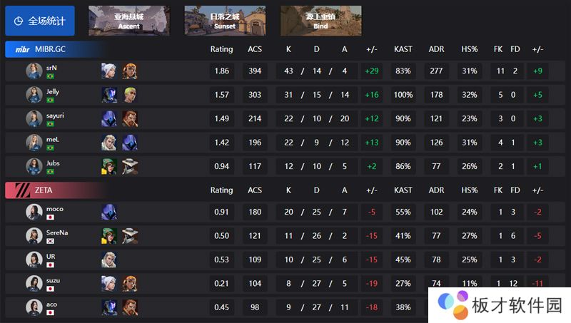 图一亚海悬城,MIBR 13:0 ZETA,本次冠军赛也是历届冠军赛极其罕见的地图零封,图二日落之城,MIBR 13:3 ZETA。两张地图MIBR都是以一个相当大的比分轻松取胜,srN选手拿到了全场最高的43总击杀。