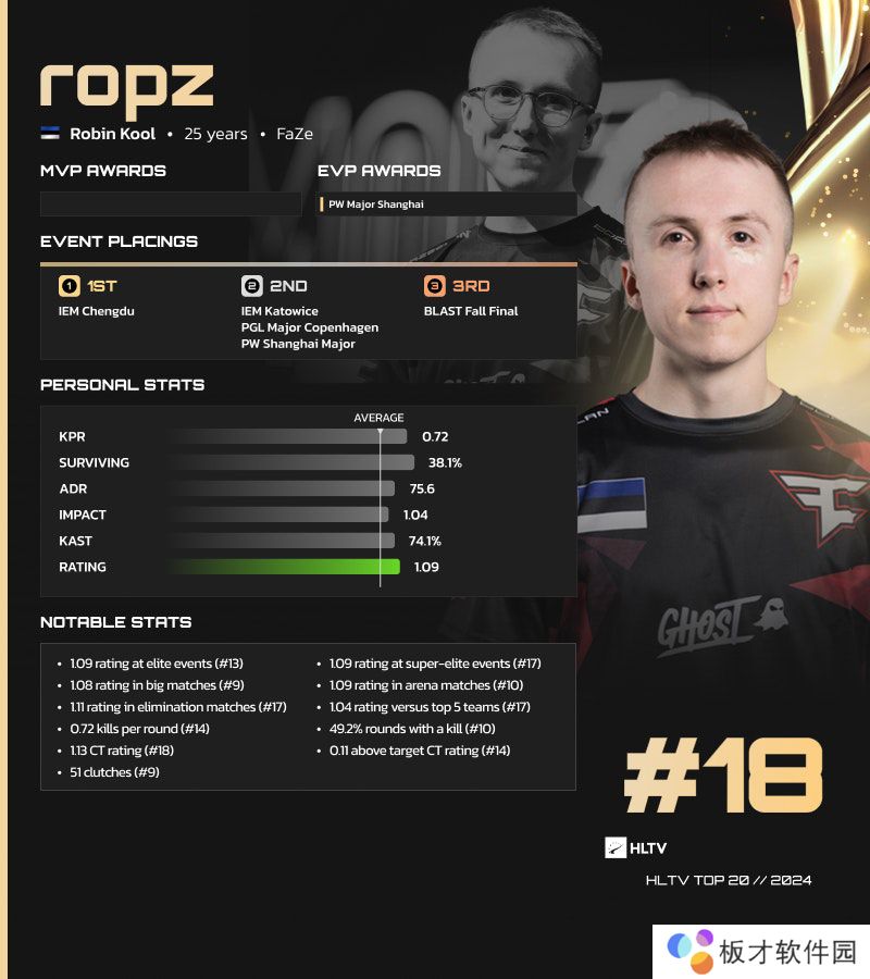 在全年参加的13项重要赛事中,ropz在12项赛事中至少是一名有价值的选手,因此在2024年TOP20选手榜单中稳居第18位。